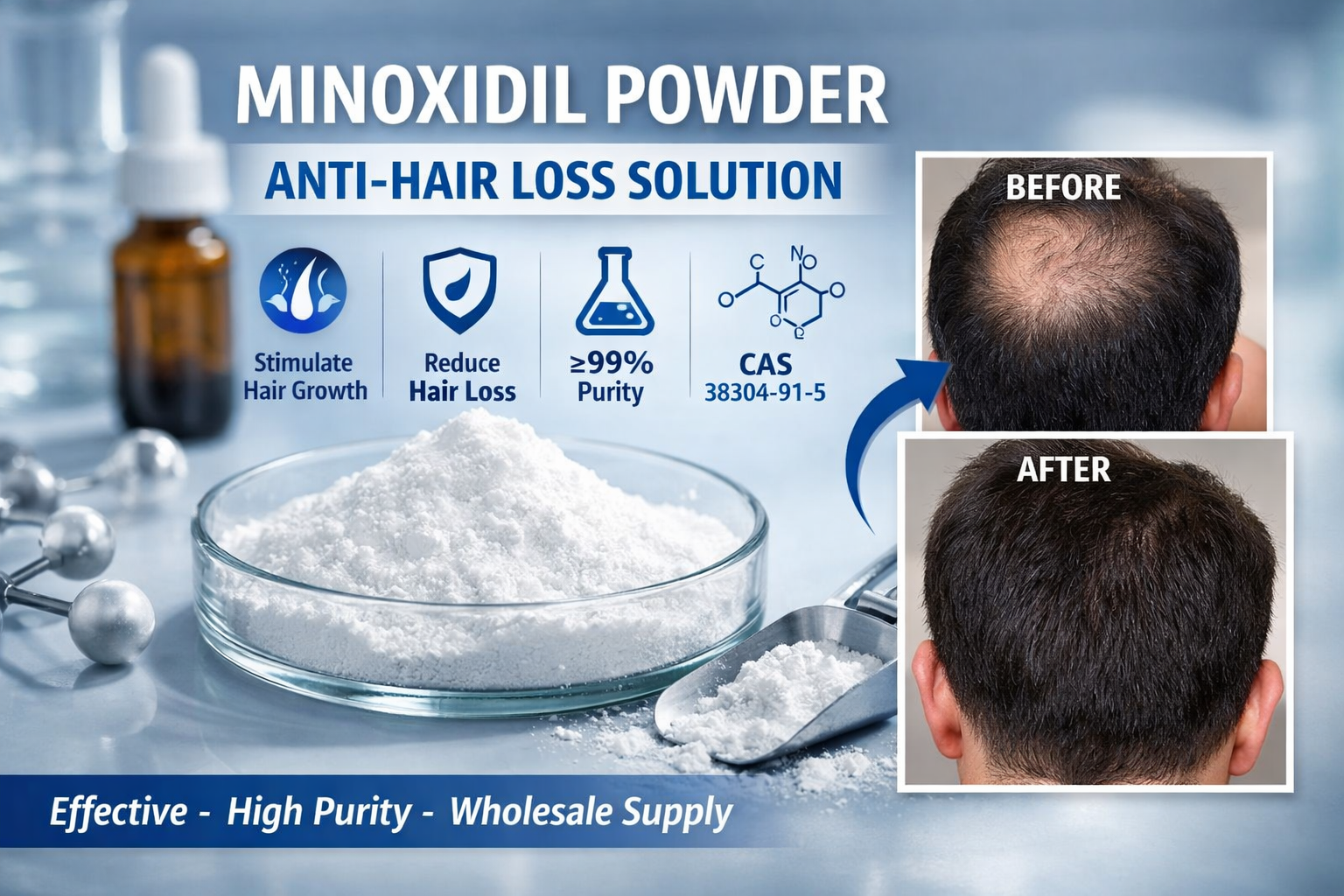 Nuestro polvo de minoxidil mayorista es un ingrediente de tratamiento de pérdida de cabello de primera calidad con un nivel de pureza de ≥99%, que cumple estrictamente con los estándares de calidad USP, EP y CP. Como polvo cristalino blanco (CAS:Las demás:, cuenta con una eficacia y estabilidad excepcionales, con una vida útil de hasta 3 años cuando se almacena en condiciones frías y secas.cada lote se somete a pruebas HPLC rigurosas, garantizando que los metales pesados (≤20 ppm) y los indicadores microbiológicos cumplan plenamente con los requisitos internacionales en materia farmacéutica y cosmética.